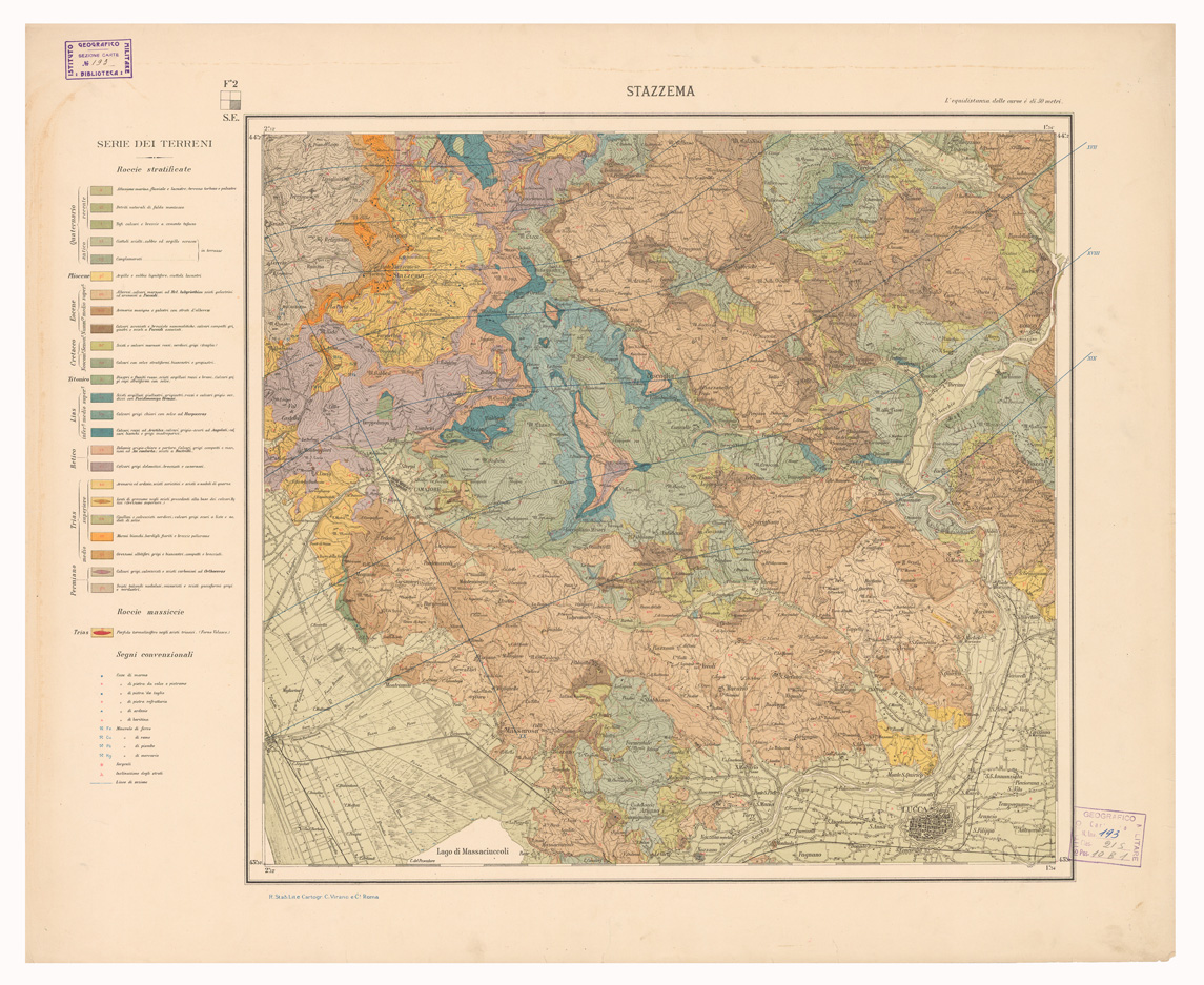 "RILEVATA E PUBBLICATA PER CURA DEL R. UFFICIO GEOLOGICO, ROMA. La base topografica della carta è la riduzione delle tavolette a 1:25.000 della carta del R. I.G.M. Rappresentazione orografica a curve di livello, l'equidistanza delle curve è di 50 metri."