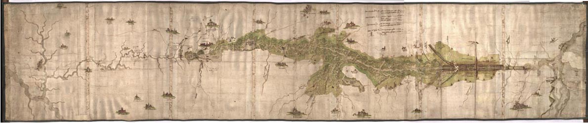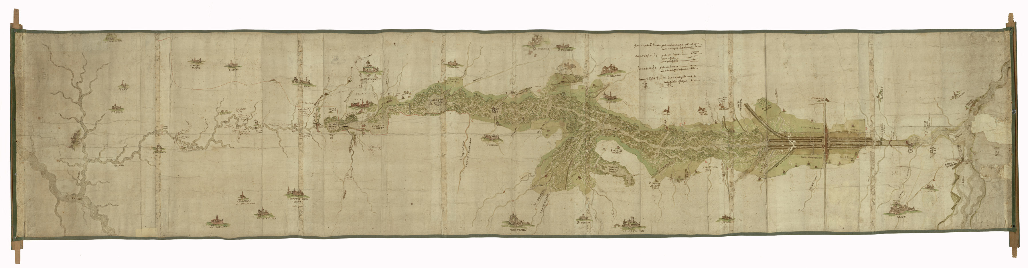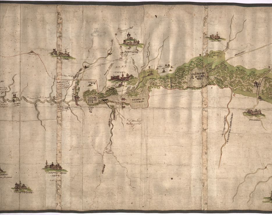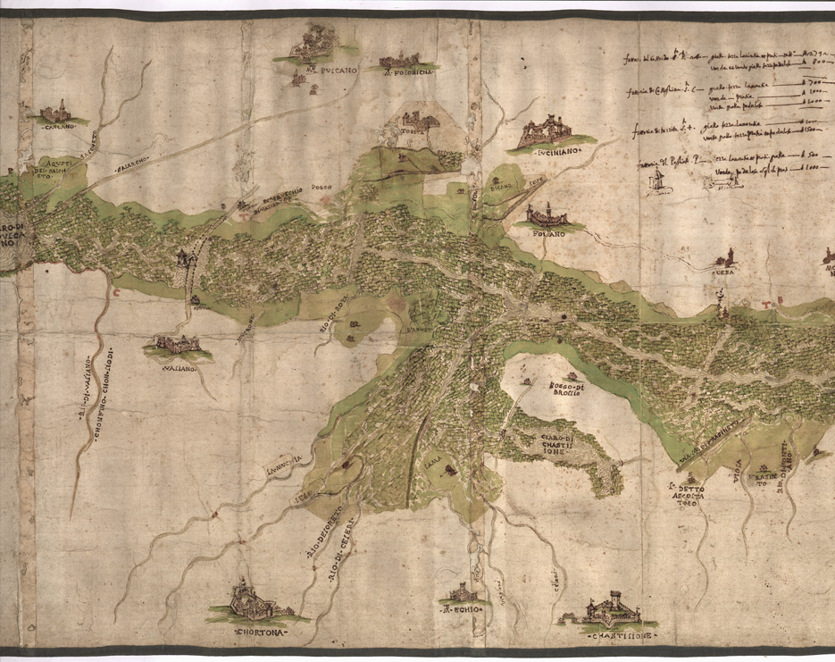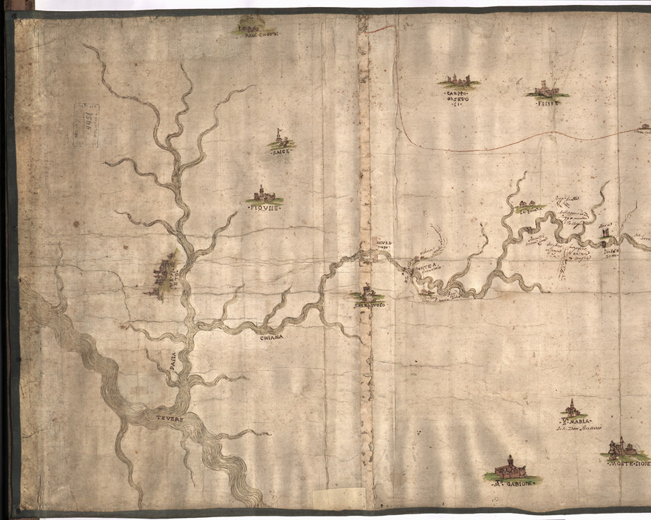 "Carta attribuibile all'ingegnere architetto statale Gherardo Mechini che insieme a vari operatori guidò le operazioni granducali di bonifica e colonizzazione della Valdichiana. La carta ha una scala di circa 1:50.000 e venne probabilmente realizzata tra gli anni 1592 e 1595, come dimostra la presenza solo parziale del Canale Maestro della Chiana che fu completato verso la fine di quel decennio. La carta è l'unione di sette fogli (montati su tela), è disegnata con vari colori rappresentanti: l'idrografia con i ponti e la viabilità, gli insediamenti anche minimi, il confine fra Granducato e Stato Pontificio ed i diversi usi agrari del suolo. Oltre alle aree palustri o "paglieti", rivestite di fitta vegetazione, ai "chiari" o specchi lacustri, si distinguono le terre boschive e lavorative, con i residui boschi talora denominati "selve di ontani", e la ricchissima rete dei fiumi e dei canali. Cfr. ROMBAI L., Rappresentare e misurare il Mondo. I.G.M., 2004, pagg. 198-199. "