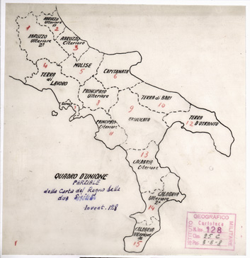 "...DIVISA IN SINGOLE PROVINCIE. Carta in ventitre fogli montati su tela, stampati a colori in litografia, eseguiti sotto la direzione dell'autore B. Marzolla. Annesso un foglio d'insieme per il Regno delle Due Sicilie alla scala di 1:2.500.000 circa, su cui trovasi scritto: "Atlante geografico di B. Marzolla pubblicandosi ora da L. Manzella, Napoli 1859, nello Stabilimento Geografico". Le carte distinguono a segni e colori i confini di stato, di provincia, di distretto, di circondario, di comune, le strade regie postali, rotabili, in costruzione, sentieri per cavalli e per pedoni, stazioni di posta, telegrafi. L'orografia è rappresentata col tratteggio a luce obliqua. Ciascun foglio contiene attorno al campo disegnato un quadro statistico-amministrativo, ed ampie notizie storiche e di geografia fisica ed economica: ognuno è distinto da un titolo particolare. Una carta analoga si trova alla Cart. d'Arch. n. 86 Docum. n. 11. "