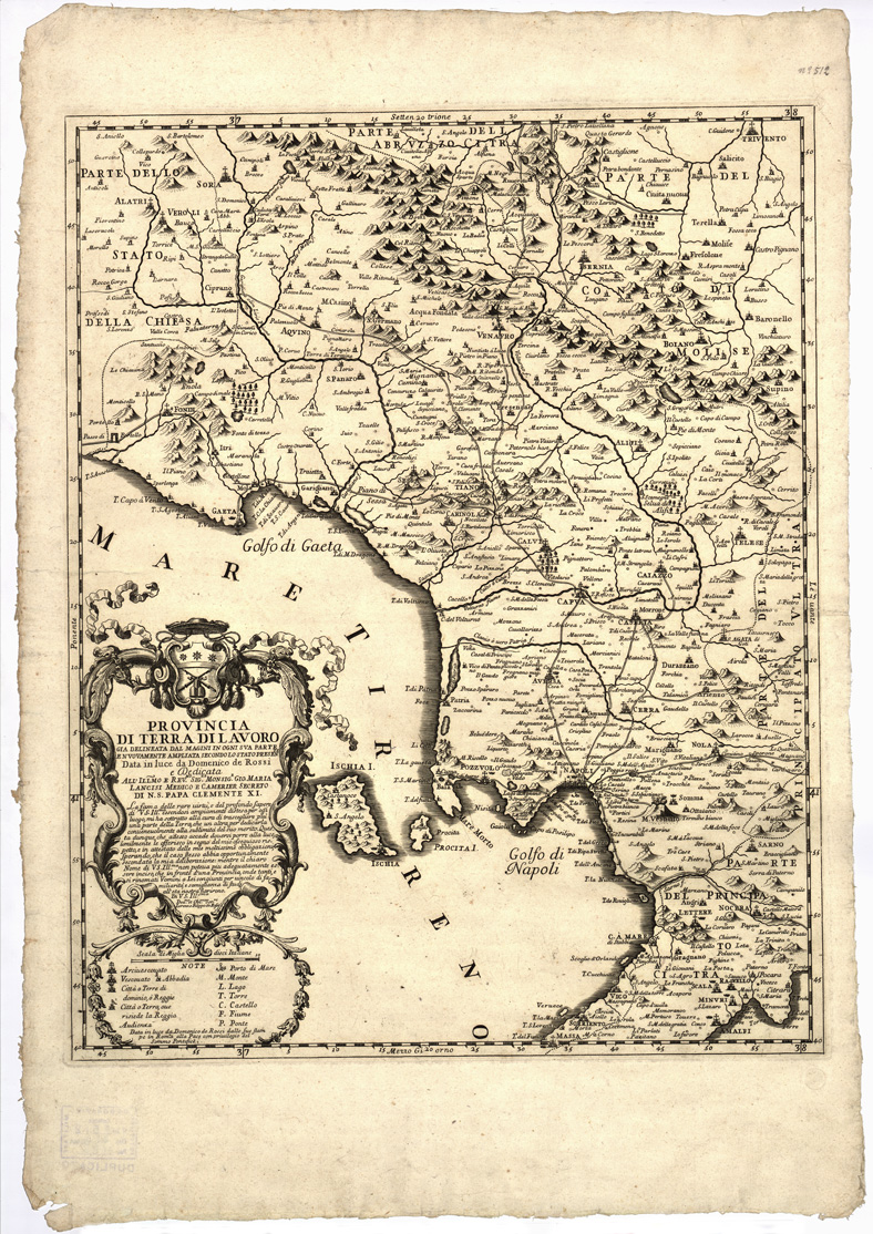 "...GIA' DELINEATA DAL MAGINI IN OGNI SUA PARTE E NUOVAMENTE AMPLIATA SECONDO LO STATO PRESENTE. DATA IN LUCE DA DOMENICO DE ROSSI E DEDICATA ALL'ILL.MO ECC., ECC., MONS. GIO. MARIA LANCISI MEDICO E CAMERIERE SEGRETO DI N. S. PAPA CLEMENTE XI. ROMA ALLA PACE. Incisione su rame in foglio unico. La dedica è firmata da Lorenzo Filippo de Rossi. (Cfr. ARRIGONI E BERTARELLI, Le carte geografiche dell 'Italia ecc., N° 2327). Le carte corrispondenti ai numeri d'inv. generale 548-514-517-549-516 e 2269-515-518-512-513 sono analoghe per tipologia."