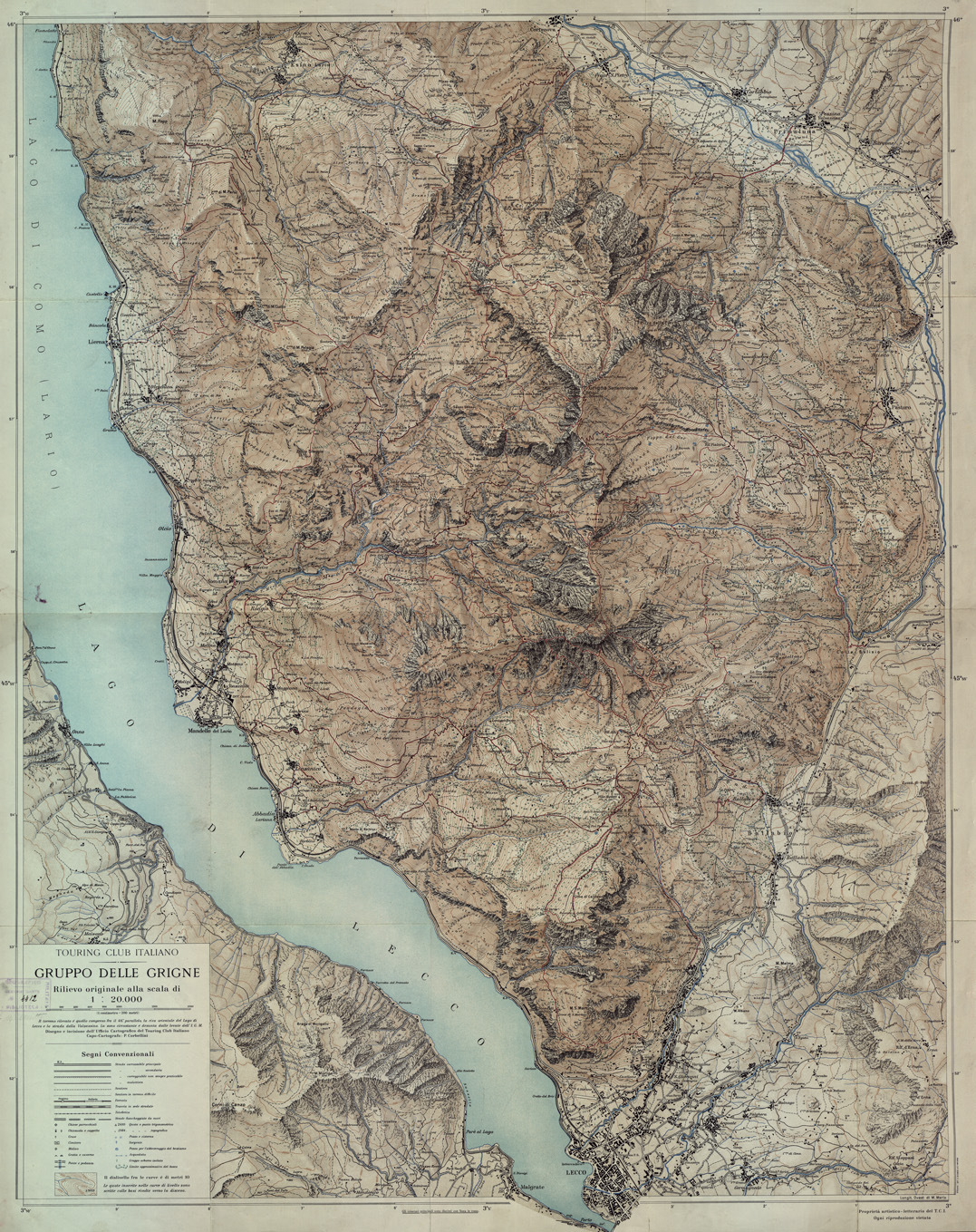 "Bella carta basata su rilievo originale per il terreno compreso tra il 46° parallelo,la riva orientale del lago di Lecco e la strada della Valvassina, e per la zona circostante su le levate dell' I.G.M. Disegno e incisione dell' Ufficio Cartografico del T.C.I. Stampa a colori con orografia dimostrata con grande evidenza plastica a mezzo di curve di livello tracciate in bistro alla equidistanza di 10 m. e trattegio (rocce) in nero, acque in azzurro, abitati, rete stradale, ecc., in nero,vegetazione boschiva in verde. Gli itinerari principali sono distinti con linea in rosso. In basso a sinistra la leggenda dei segni convenzionali. Due copie."