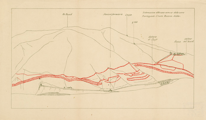 "Rappresentazione orografica prospettica. In alto a destra è presente la dicitura "Sistemazione difensiva nemica della zona fronteggiante il tratto Ronzina-Doblar". I.G.M. (FI)."