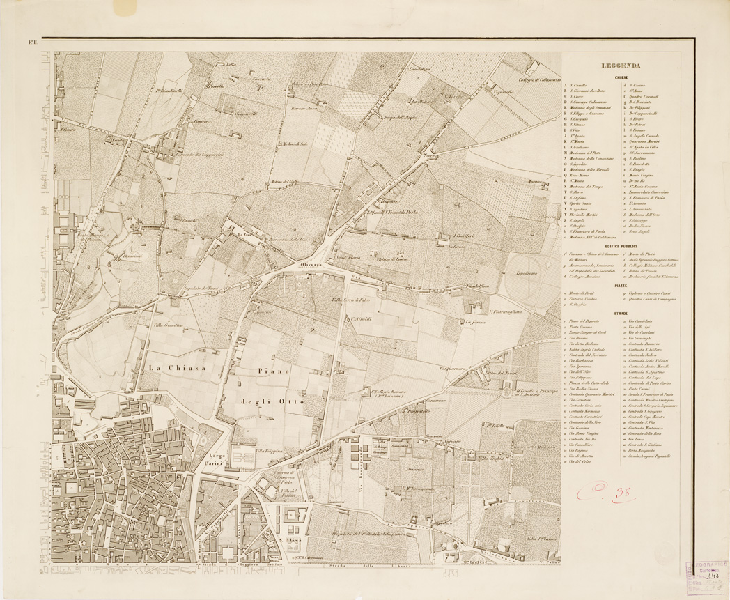 "Carta tratta da nitida incisione su rame, stampata in nero, in quattro fogli, ognuno delle dimensioni di m. 0,48x0,61, pubblicata dall'Officio Superiore dello Stato Maggiore, Sez. di Napoli, alla scala di 1:5.000. Sono distinte le varie colture. Ciascun foglio reca un elenco numerico delle principali costruzioni, strade e piazze. La scala grafica è calcolata in miglia geografiche, passi geodetici, chilometri e metri. Gli scandagli sono calcolati in metri. Al numero d' inventario 5114 sono archiviati i duplicati di questa carta. Confronta anche la stessa carta al numero d'inventario 1890 che porta la dicitura "Riconosciuta e rettificata nel 1873 "."