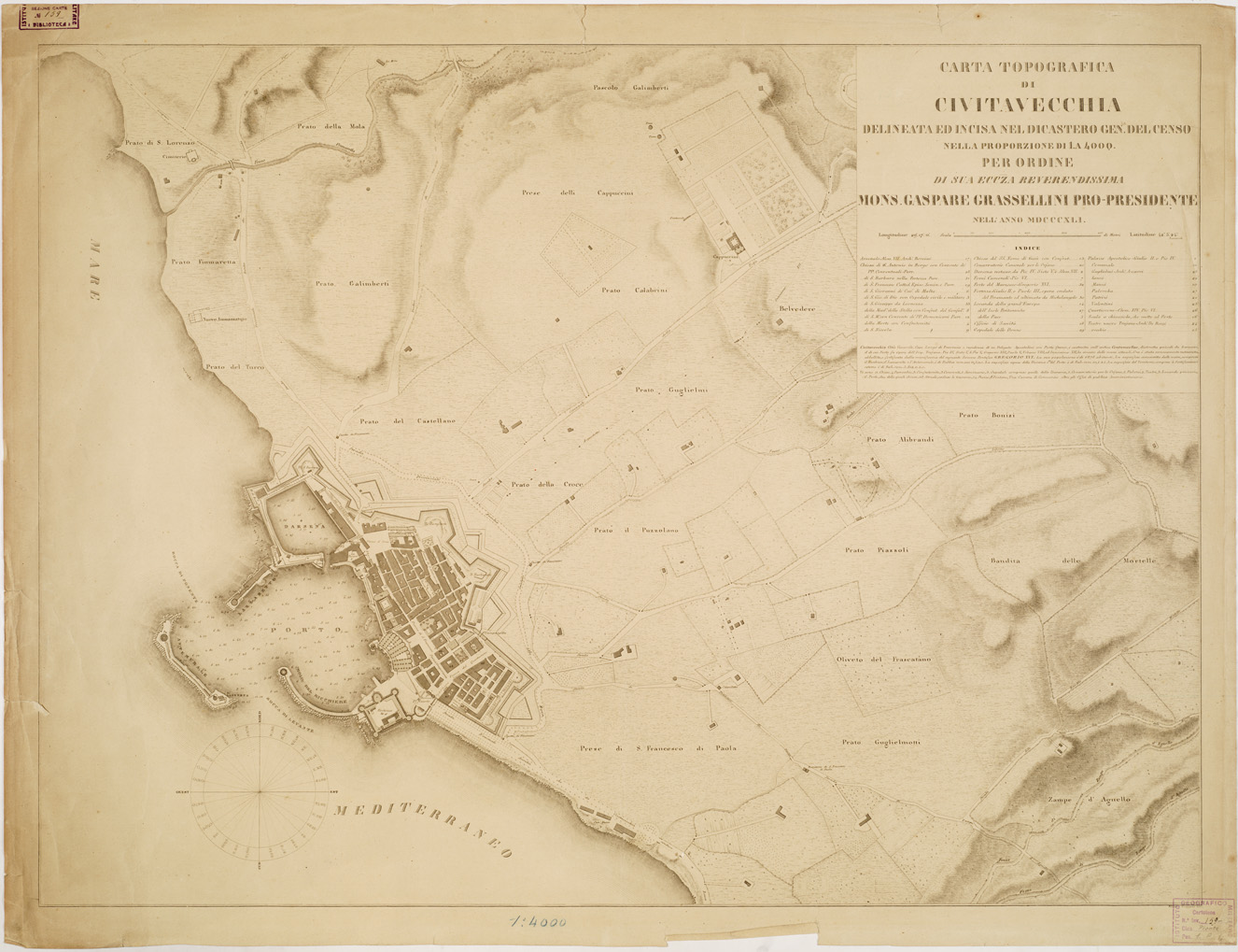 "...DELINEATA ED INCISA NEL DICASTERO GEN.LE DEL CENSO NELLA PROPORZIONE DI 1:4.000 PER ORDINE DI SUA ECC.ZA REVERENDISSIMA MONS. GASPARE GRASSELLINI PRO-PRESIDENTE NELL'ANNO MDCCCXLI. Foglio tratto da incisione su rame, stampato in nero, con orografia rappresentata a mezzo di tratteggio. In alto a destra elenco numerico delle principali costruzioni e cenno storico sulla città. Filippo Troiani incise."