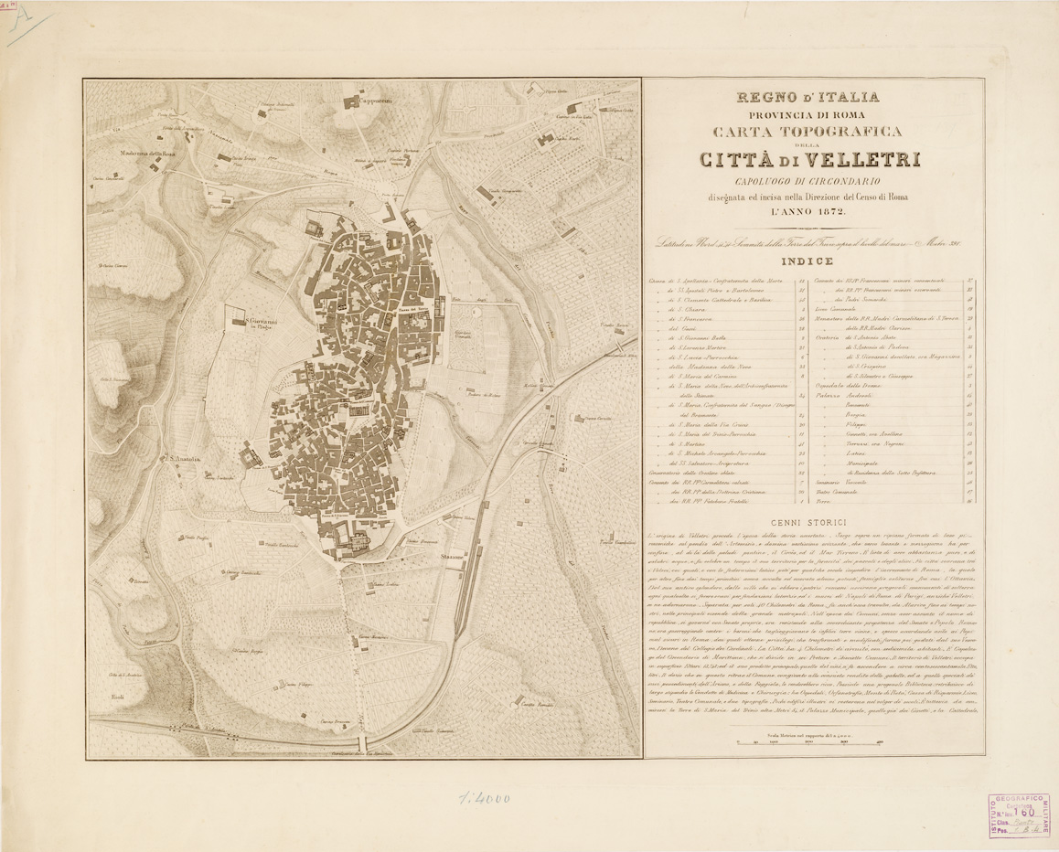 "...CAPOLUOGO DI CIRCONDARIO DISEGNATA ED INCISA NELLA DIREZIONE DEL CENSO DI ROMA L'ANNO 1872. Un foglio tratto da nitida incisione su rame, stampato in nero, con orografia dimostrata a mezzo di tratteggio. A destra elenco numerico delle principali costruzioni e cenni storici sulla città. Due copie."