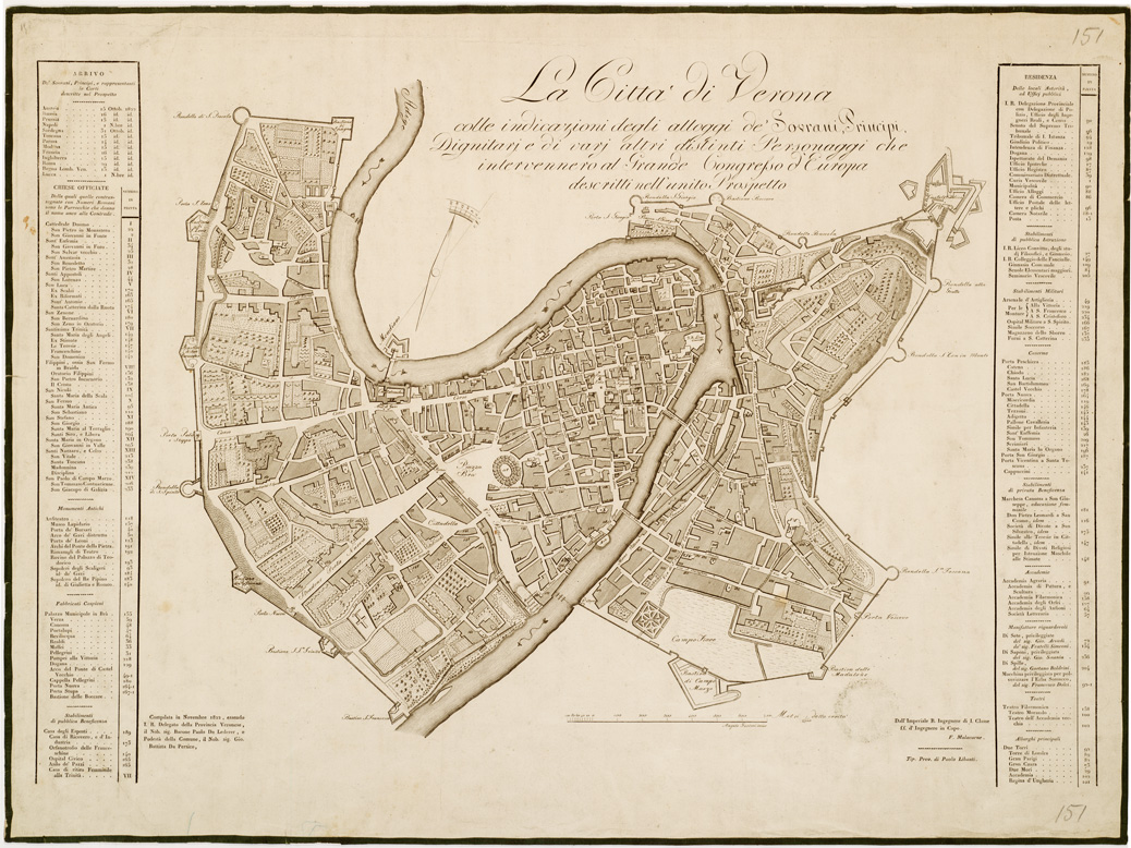 LA CITTA' DI VERONA COLLE INDICAZIONI DEGLI ALLOGGI DE' SOVRANI, PRINCIPI DIGNITARI E DI VARI ALTRI DISTINTI PERSONAGGI CHE INTERVENNERO AL GRANDE CONGRESSO D'EUROPA DESCRITTI NELL'UNITO PROSPETTO.
