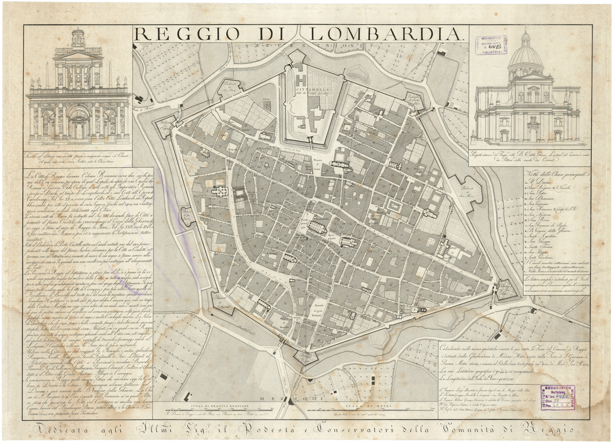 "...DEDICATA AGLI ILL.MI SIG. IL PODESTA' E CONSERVATORI DELLA COMUNITA' DI REGGIO. Pianta di Reggio Emilia in foglio unico, costruita da L. Manzotti, incisa da A. Gajani nel 1817, sotto la direzione di Venturi. Posizione geografica calcolata dall' Ing. Mil. G. Carandini. E' corredata di notizie generali della città, dell'elenco numerico delle Chiese principali e di due prospetti di Chiese disegnati da G. Marchelli. Scale grafiche in braccia reggiane e in metri. "