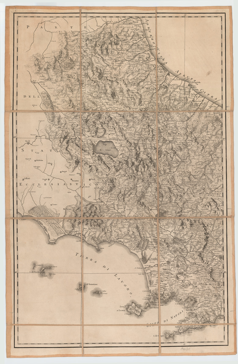 "Carta costruita da Antonio Rizzi-Zannoni dietro incarico di Ferdinando Galiani politico del Regno di Napoli e col concorso del Governo Reale. Poggiata sui documenti editi ed inediti allora disponibili ma priva di ogni e qualunque base astronomica e geodetica, essa tuttavia rappresenta un grande progresso rispettoalle preesistenti carte del Reame. E' notevole per la nitida incisione su rame, per la evidenza plastica data alla raffigurazione orografica ottenuta artisticamente col tratteggio, e per la ricchezza di particolari. Si compone di quattro fogli montati su tela a stacchi stampati in nero. Incisione di Germain e Perrier: scritture di G. André. La carta rappresenta tutto il territorio del Reame dai confini con lo Stato Pontificio allo Stretto di Messina. Per la storia di essa e per la illustrazione dell'opera svolta susseguentemente dal Rizzi Zannoni. Cfr. MORI A., La cartografia ufficiale in Italia ecc., 1922."