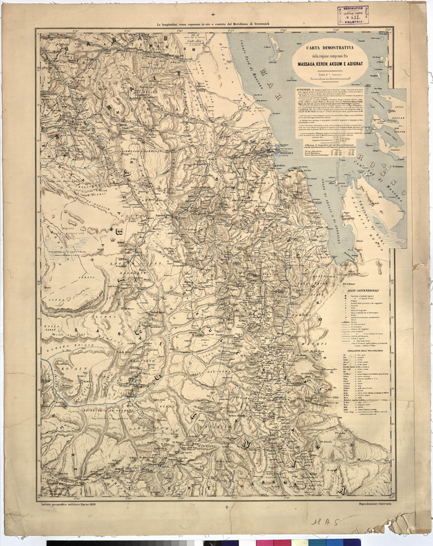 "I.G.M. La carta fu pubblicata in previsione degli avvenimenti politico-militari nelle regioni limitrofe ai possedimenti di Massaua. Essa comprende, oltre i dintorni immediati di Massaua, tutto il paese occupato dai Mensa, Habab e Bogos fino a Cheren, il Tigré settentrionale con Adua e Acsun, e la penisola di Buri. La compilazione fu basata sulle relazioni, gli scritti e i disegni dei più accreditati geografi e dei viaggiatori che visitarono e illustrarono la regione, oltre le informazioni di ufficiali che percorsero quella zona. Furono consultati i lavori del D'Abbadie, Münzinger, Lejean, Heuglin, Réclus, Petermann e fra gli italiani, del Sapeto, Issel, Matteucci, Vigoni, Bianchi, Nerazzini, Colaci. Per i dintorni immediati di Massaua servirono i rilievi eseguiti nel 1885 dal Ten. Lavallea. Furono pure impiegati i rilievi idrografici fatti dalla R. Cannoniera Scilla nel 1886, ed i dati delle carte dello Stato Maggiore Egiziano. I confini tra l'Abissinia e le regioni circostanti furono desunti dalla "Map of Abyssinia and adjacent Red See coast" compilata dall'Ufficio Informazioni presso il Ministero della Guerra britannico nel 1884 e riprodotti anche nella Carta dell'Abissinia e coste adiacenti del Mar Rosso alla scala di 1:1.750.000 edita dell'I.G.M. nel 1885. La carta riassume cosi tutte le conoscenze che della nostra colonia si avevano all'epoca della pubblicazione. I nomi sono scritti in grafia italiana. Per la posizione geografica di Massaua servirono le determinazioni della R. Nave "Scilla" risultando essere 15° 36' 41" lat. nord e 29° 28' 9" long. est Greenwich. Le latitudini sono espresse in arco (gradi e minuti) le longitudini in tempo (ore e minuti) le altitudini in metri. Frequenti le quote altimetriche. La carta è riprodotta in cromolitografia a colori nero per la planimetria (strade, itinerari, confini, centri abitati) e le scritture, bistro per l'orografia (tratteggio), azzurro per le acque. La carta originale alla scala di 1:250.000 è in quattro fogli (cm. 36 x 48). Venne fatta poi una riduzione al 400.000 in un foglio solo (cm. 46 x 61). Una copia della carta è montata su tela, e custodita in busta."