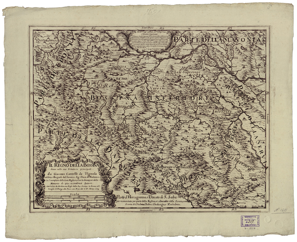 "Autore Giacomo Cantelli da Vignola Fogli 1 stampa incisa su rame in nero rappresentazione orografica a tratteggio. Inventario SBN 7-507"