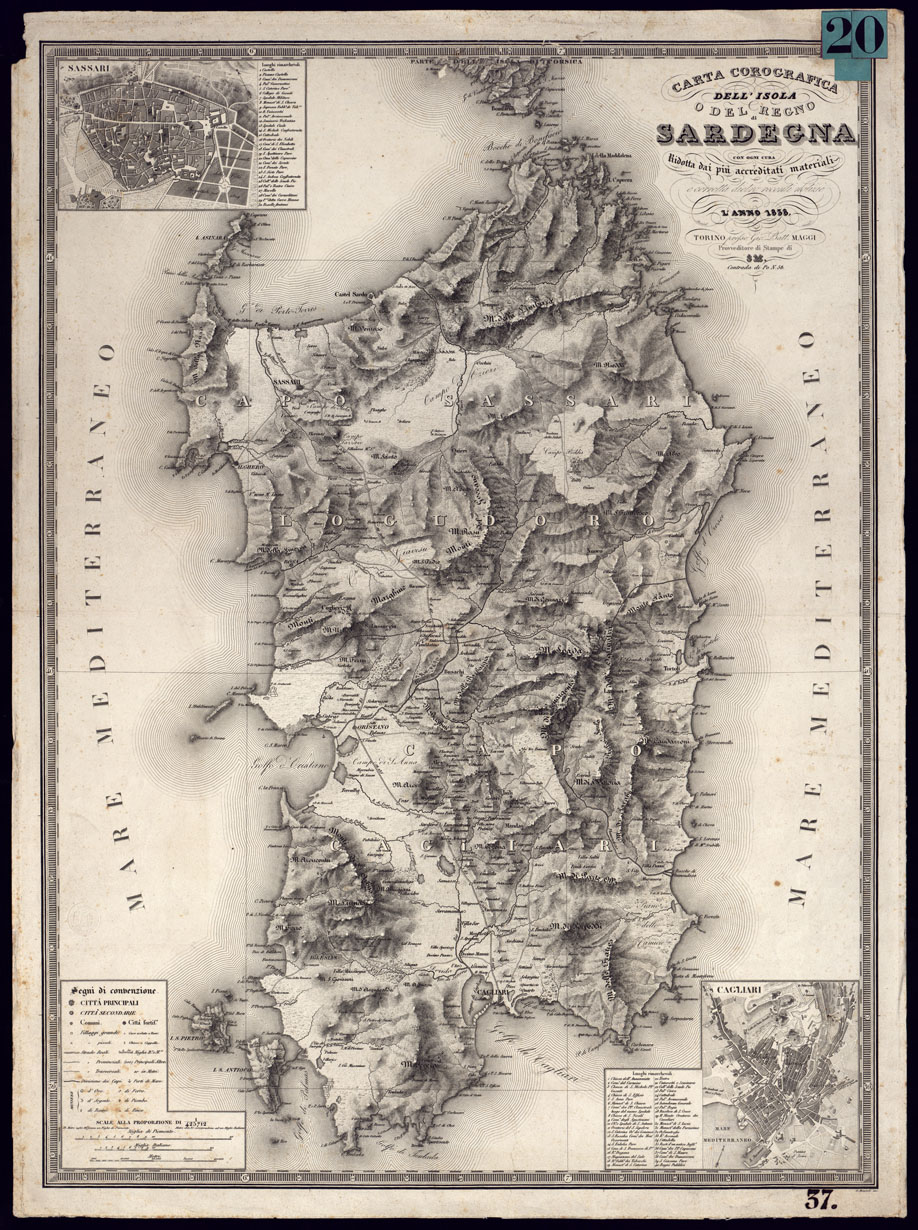 "Foglio unico inciso a Torino nel 1838 presso G. Batta Maggi provveditore di stampe di S. M.. La carta reca negli angoli nord-ovest e sud-est rispettivamente le piante delle città di Sassari e di Cagliari. In basso a destra del foglio vi sono indicati i segni convenzionali."