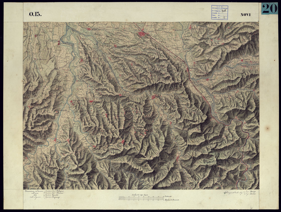 CARTA TOPOGRAFICA DEGLI STATI DI TERRA FERMA DI S.S.R.M. CARLO ALBERTO RE DI SARDEGNA FATTA DAL CORPO DELLO STATO MAGGIORE COMANDATO DAL TEN.TE GEN.LE B.NE DI MONTHOUX ALLA SCALA DI 1 50.000 1831 - FOGLIO O.13 NOVI.
