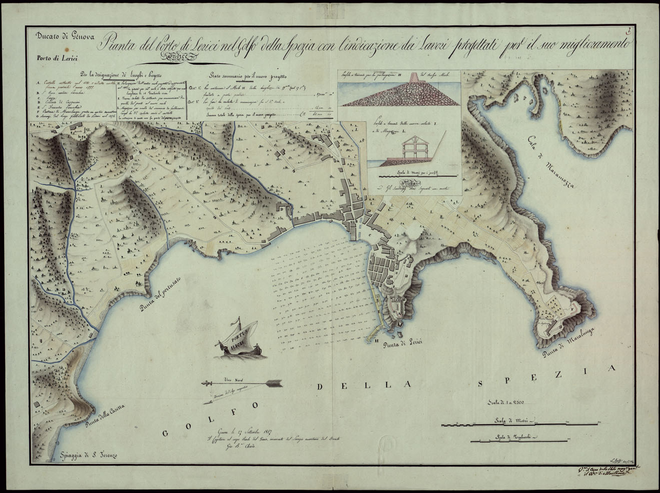 PIANTA DEL GOLFO DI LERICI NEL GOLFO DELLA SPEZIA CON L'INDICAZIONE DEI LAVORI PROGETTATI PER IL SUO MIGLIORAMENTO - DUCATO DI GENOVA PORTO DI LERICI.