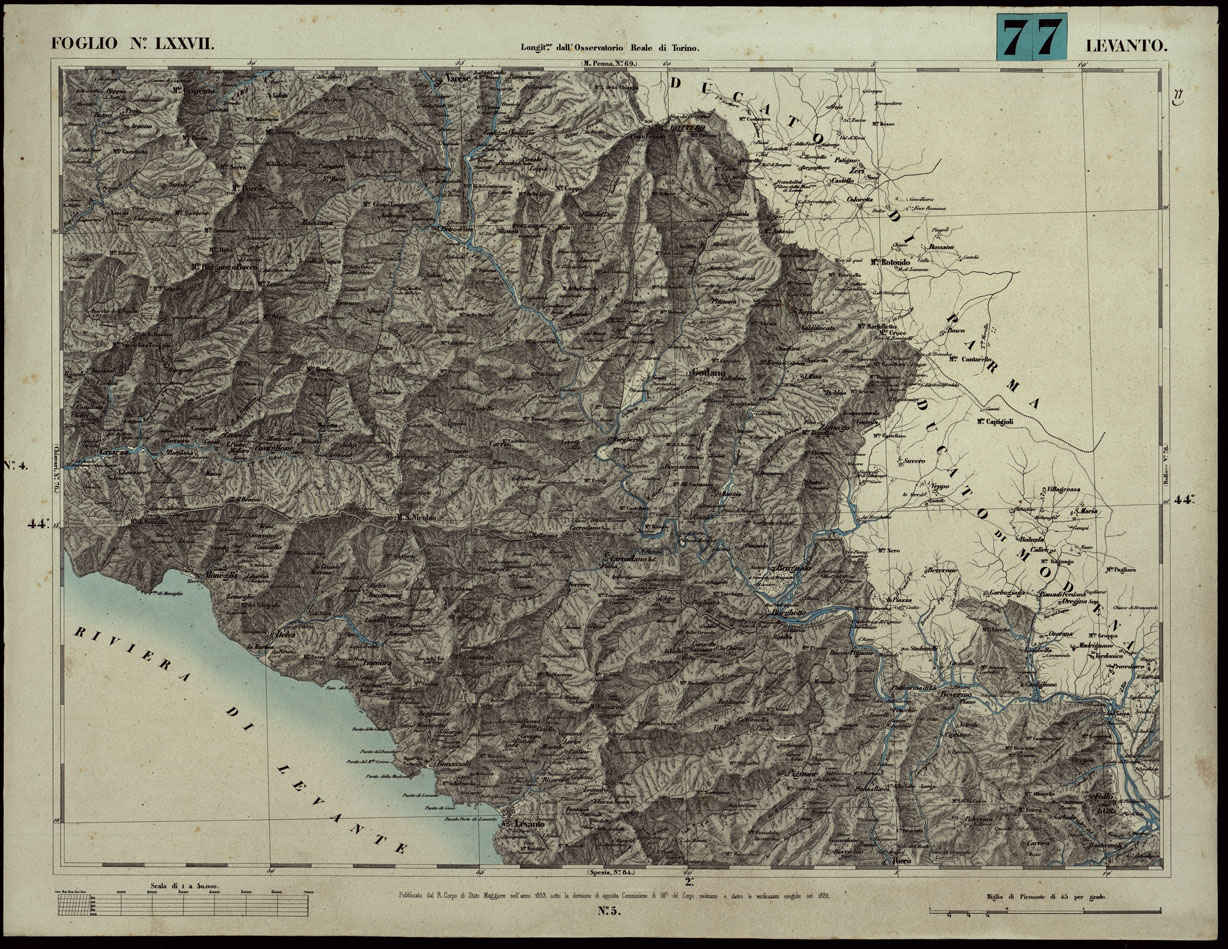 CARTA TOPOGRAFICA DEGLI STATI IN TERRAFERMA DI S.M. IL RE DI SARDEGNA ALLA SCALA DI 1A 50.000. OPERA DEL CORPO REALE DELLO STATO MAGGIORE - FOGLIO N.°LXXVII LEVANTO