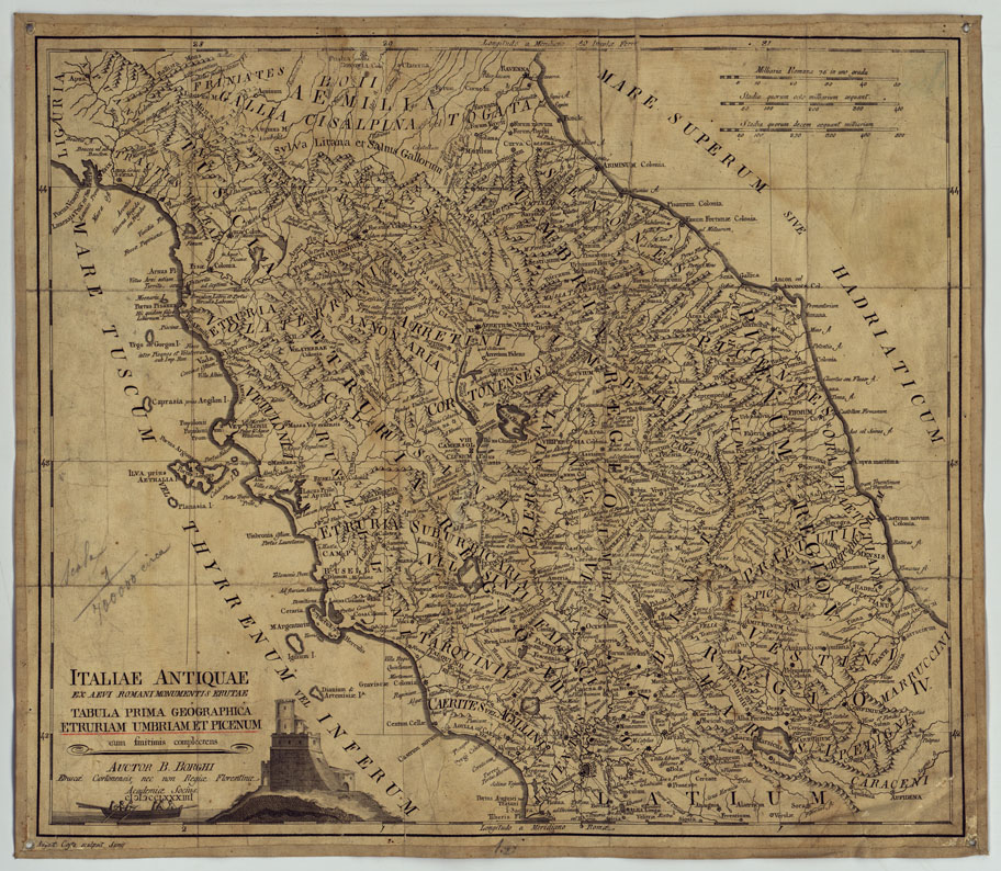 ITALIAE ANTIQUAE EX AEVI ROMANI MONUMENTIS ERUTAE TABULA PRIMA GEOGRAPHICA ETRURIAM UMBRIAM ET PICENUM CUM FINITIMIS COMPLECTENS AUCTOR B. BORGHI ETRUSCAE CORTONENSIS, NEC NON REGIAE FLORENTINAE ACADEMIAE SOCIUS
