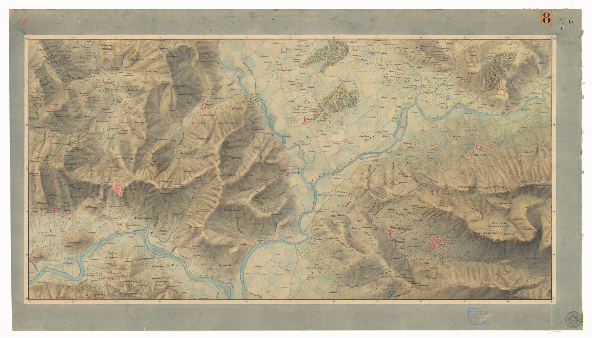 "Disegni originali della Carta dei dintorni di Napoli eseguiti nell'Officio Topografico dell'ex Regno di Napoli. Bella carta in 23 fogli montati su tela, disegnati ad acquarello. Rappresentano l'orografia col tratteggio in alcuni fogli sussidiato da curve di livello tracciate in bistro gli abitati sono in rosso le acque in azzurro vegetazioni e colture in verde strade in nero. Di notevole interesse per la ricchezza dei particolari e per la nitidezza del disegno."