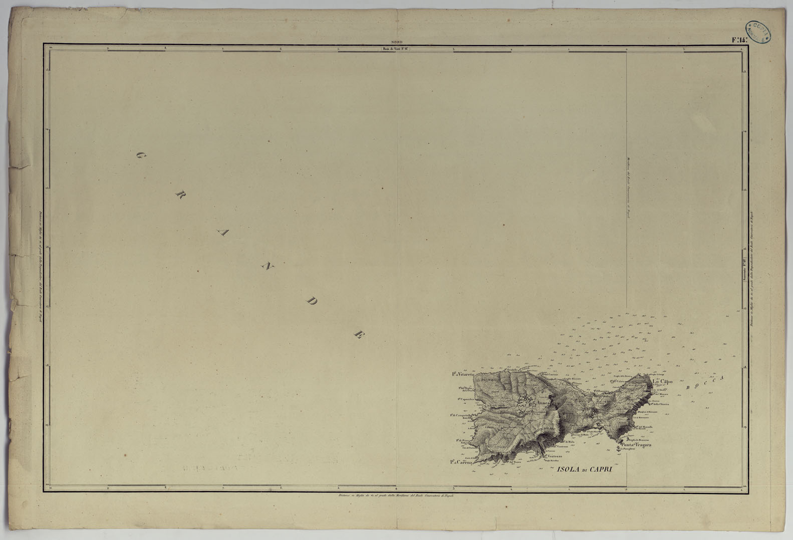 "DISEGNATA ED INCISA NELL'OFFICIO TOPOGRAFICO DI NAPOLI. Questa carta si compone di 15 fogli (in origine 9, e poi portati a 12) incisi su rame, stampati in nero. Essa è basata sulle mappe catastali già esistenti al 10.000, ridotte alla scala di 1: 20.000, riconosciute sul terreno e poggiate sui lavori di triangolazione eseguiti dal 1816 al 1819 nel territorio di Napoli, con aggiunta dei rilievi idrografici lungo le coste del Golfo e delle Isole. Le longitudini sono calcolate dal meridiano del R. Osservatorio di Napoli. L ' orografia è rappresentata con fine tratteggio a luce obliqua. Gli scandagli sono calcolati in passi. La carta è notevole per la chiarezza del disegno. Essa mostra centri abitati, strade, fiumi, colture e vegetazioni, ecc., con particolare ricchezza di dettagli. IL foglio N° 7 contiene il titolo e varie "piante delle principali antichità del territorio di Pozzuoli". Il foglio N° 10 contiene l ' Isola d ' Ischia il foglio N° 11 la rosa dei venti il foglio N° 13 la " Pianta degli scavi di Pompei nello stato in cui si trovano alla fine del 1875. Delineata ed incisa nel R. Officio Topografico della guerra. Napoli" alla scala di 1: 2.000 il foglio N° 14 l'Isola di Capri. Due copie d'Archivio (Cart. d ' Arch. N° 86, Docum. N° 14) una delle quali incompleta con la pianta di Pompei a data imprecisata 184.. Altre due copie (N° 78 d ' inv. gen. ) sono pure incomplete con la pianta di Pompei alla data 1875 e annesso un quadro d ' unione."