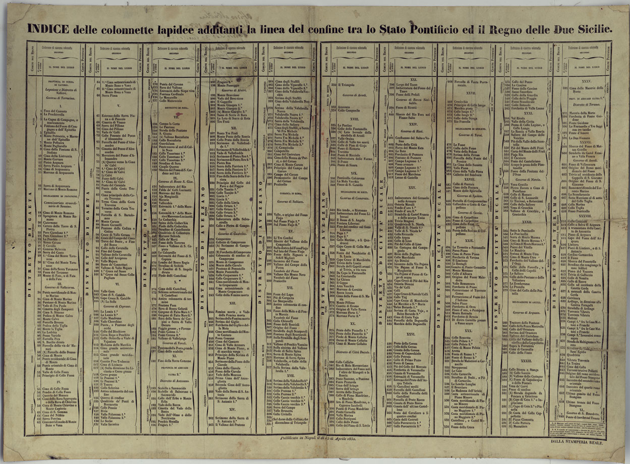 INDICE DELLE COLONNETTE LAPIDEE ADDITTANTI LA LIENEA DEL CONFINE TRA LO STATO PONTIFICIO E REGNO DELLE DUE SICILIE PUBBLICATO IN NAPOLI IL DI 15 DI APRILE 1852. DALLA STAMPERIA REALE.