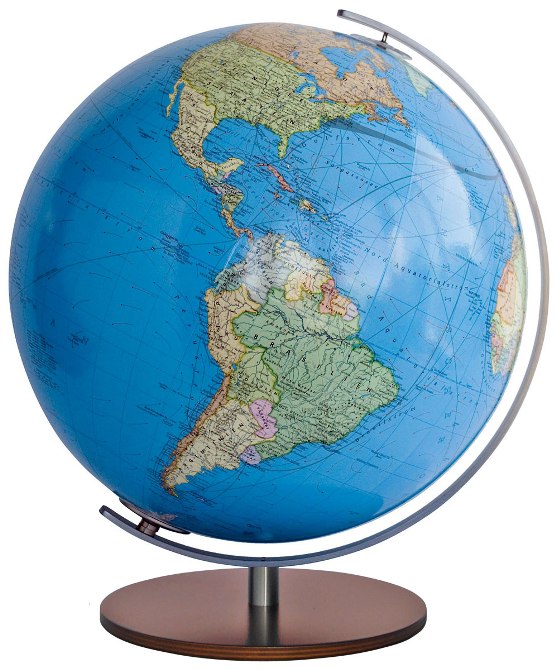 Hand coated, deskstanding globe. Double effect (political / physical illuminated). Wooden base and metal meridian.