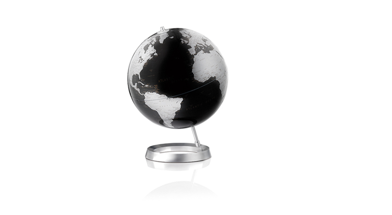 Stand aluminium. Map metallic black. Designed by Atmosphere. Not illuminated globe.