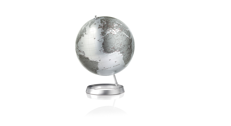 Stand aluminium. Map metallic silver. Designed by Atmosphere. Not illuminated globe.