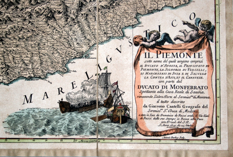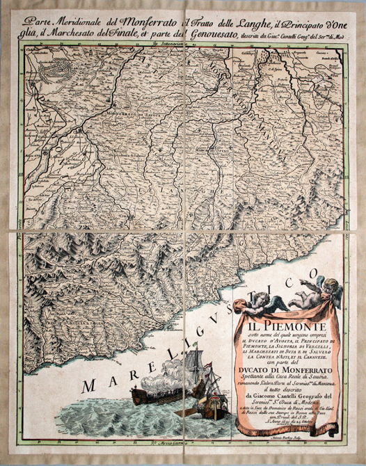"Edizione particolarmente interessante opera del Cantelli da Vignola, questa mappa del Piemonte realizzata in quattro fogli riuniti su tela, fa parte del 'Mercurio Geografico' edito in Roma dal Rossi. L' orografia è prospettica e i boschi sono indicati con alberelli. La rete stradale è tracciata, mentre i principali centri abitati sono rappresentati schematicamente secondo la loro pianta. Sono distinti gli arcivescovadi, i vescovadi, i feudi imperiali e quelli della Chiesa. Realizzata con la tecnica dell'incisione su rame, è costituita da più fogli montati su 'tela a stacchi', al fine di migliorarne la conservazione, agevolarne la leggibilità e facilitarne il trasporto. Al processo di montaggio segue quello dell'acquerellatura, realizzata a mano, allo scopo di conferire al soggetto un gradevole effetto policromo."