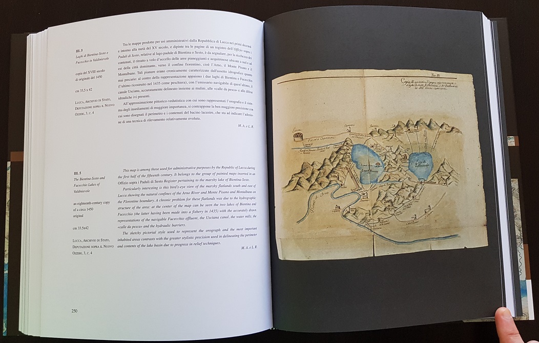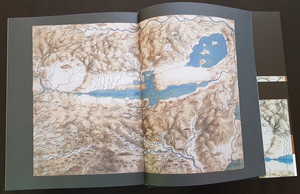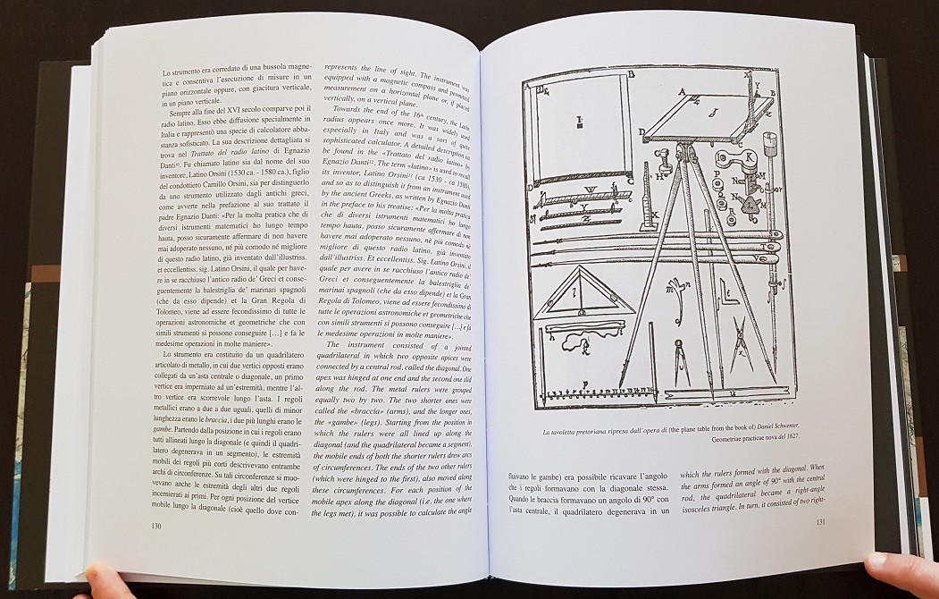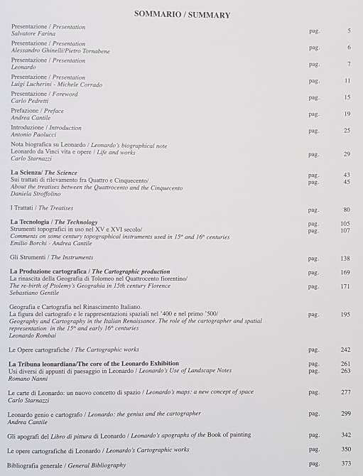 The book is written in italian and english. The italian text is translated in english in the same page. On the occasion of the Leonardo's 500th anniversary, IGM proposes the reprint of the volume LEONARDO GENIO E CARTOGRAFO. LA RAPPRESENTAZIONE DEL TERRITORIO TRA SCIENZA ED ARTE It's a big format volume of 384 pages with colored images of maps, tables, and instruments.