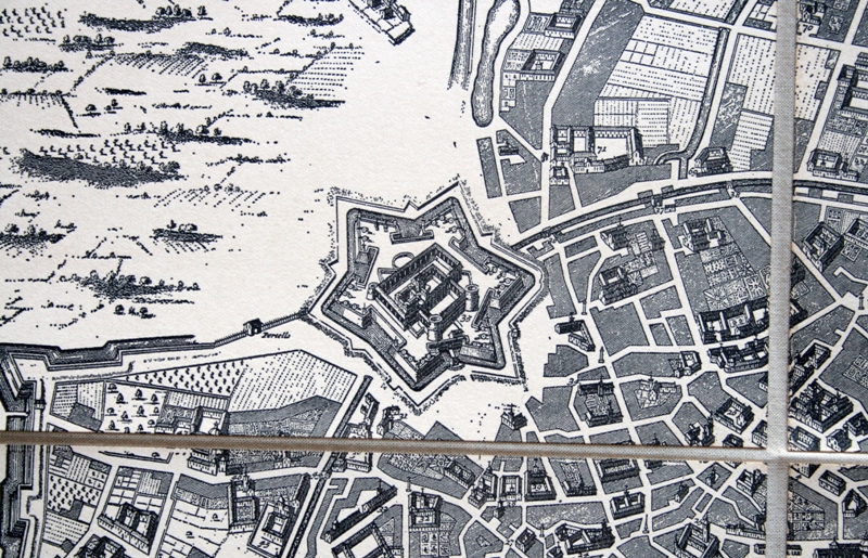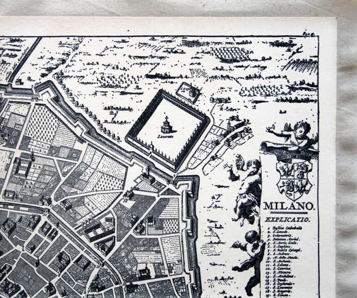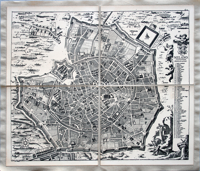 "Bella pianta semiprospettica della città di Milano, realizzata in scala 1: 10.250. In essa sono rappresentati i principali edifici dei quali è dato un elenco numerico. Realizzata con la tecnica dell'incisione su rame, è costituita da più fogli montati su 'tela a stacchi', al fine di migliorarne la conservazione, agevolarne la leggibilità e facilitarne il trasporto. "