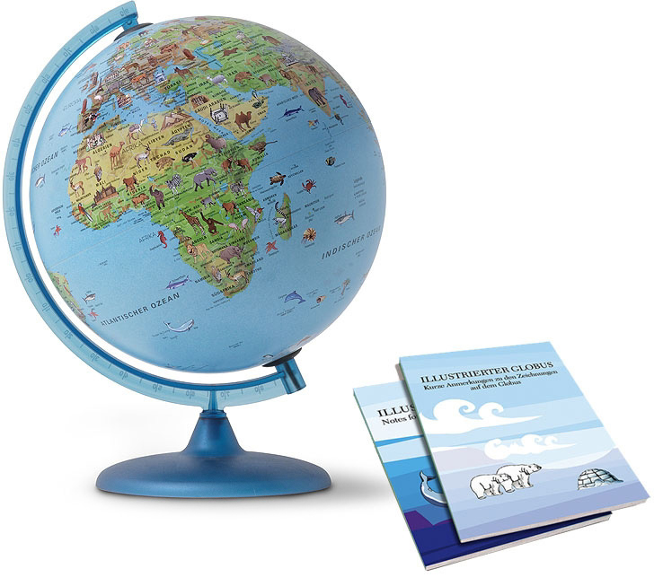 Illumidated geographical globe. Double effect (physical / political illuminated). Blue plastic base and arc. Featuring illustrations of mythical animals and characters around the world. Small book included.
