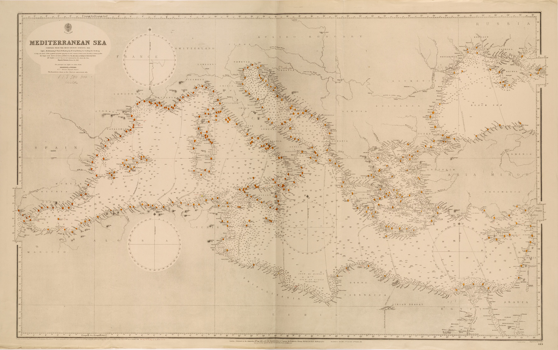 "Serie di carte nautiche a varia scala del bacino del mare Mediterraneo edite dall' Ufficio Idrografico dell' Ammiragliato Inglese compilate negli anni dal 1812 al 1882 e parzialmente aggiornate negli anni dal 1910 al 1920 ( file da SE000351 a SE000411 )"