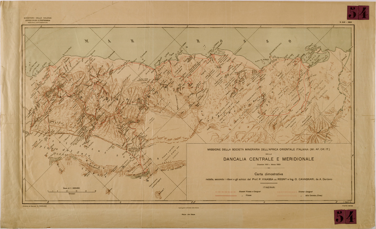 "Missione della società mineraria dell'Africa orientale Italiana nella Dancalia, dicembre 1919 marzo 1920, carta dimostrativa, redatta secondo i rilievi e gli schizzi del prof. P. Vinassa de Regny e ing. O. Cavagnari, da A. Dardano."
