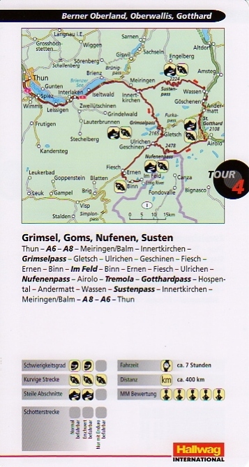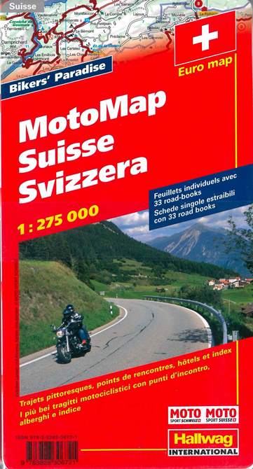 Moto map Switzerland. Road map highlighting the most spectacular scenic routes of Switzerland. Meeting points, hotels and index. Individueal water resistant sheets with 33 road books including street evaluation, degree of difficulty, distance and travelling time. Legend in 6 languages.