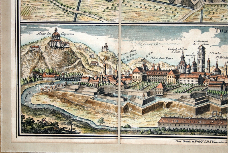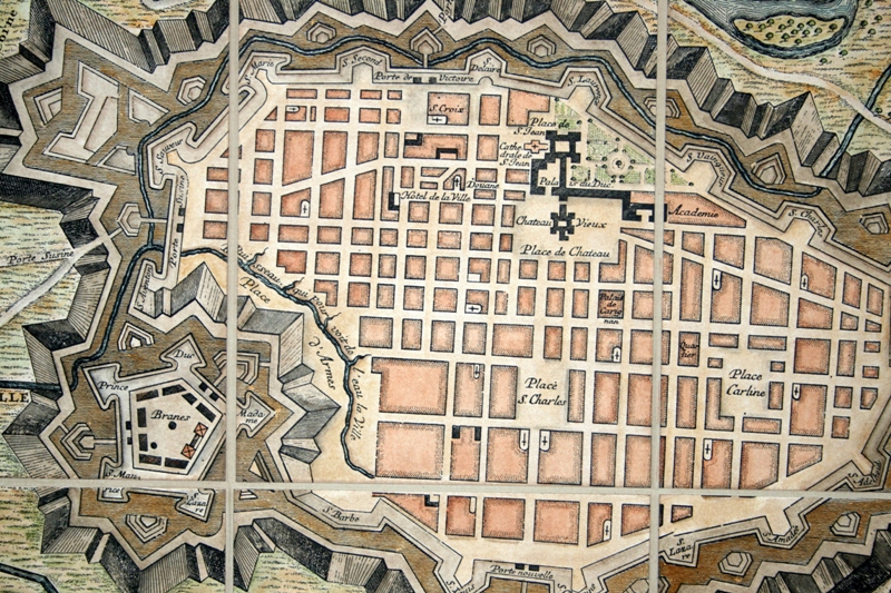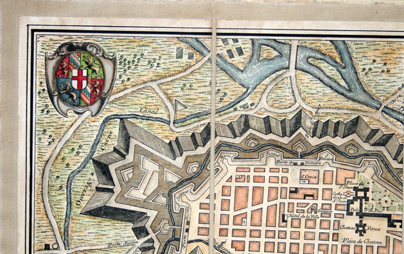 Realized according to the copper engraving technique this work consists of several sheets on cuts of cloth, which improves its maintenance, makes its legibility casier and facilitates the transport. The last process is the watercolour painting (handwork), in order to obtain a map with a nice polychromatic effect.
