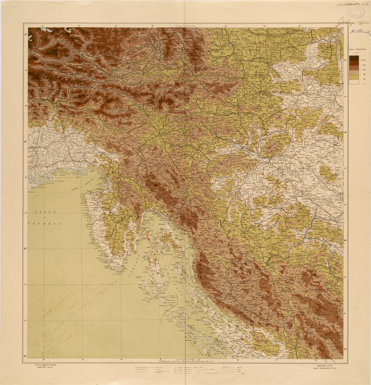 "Dalla carta corografica d' Italia al 500.000, carta d' insieme comprendente il Veneto ( dal Tagliamento ), l' Istria e la Dalmazia. Proiezione di Bonne."
