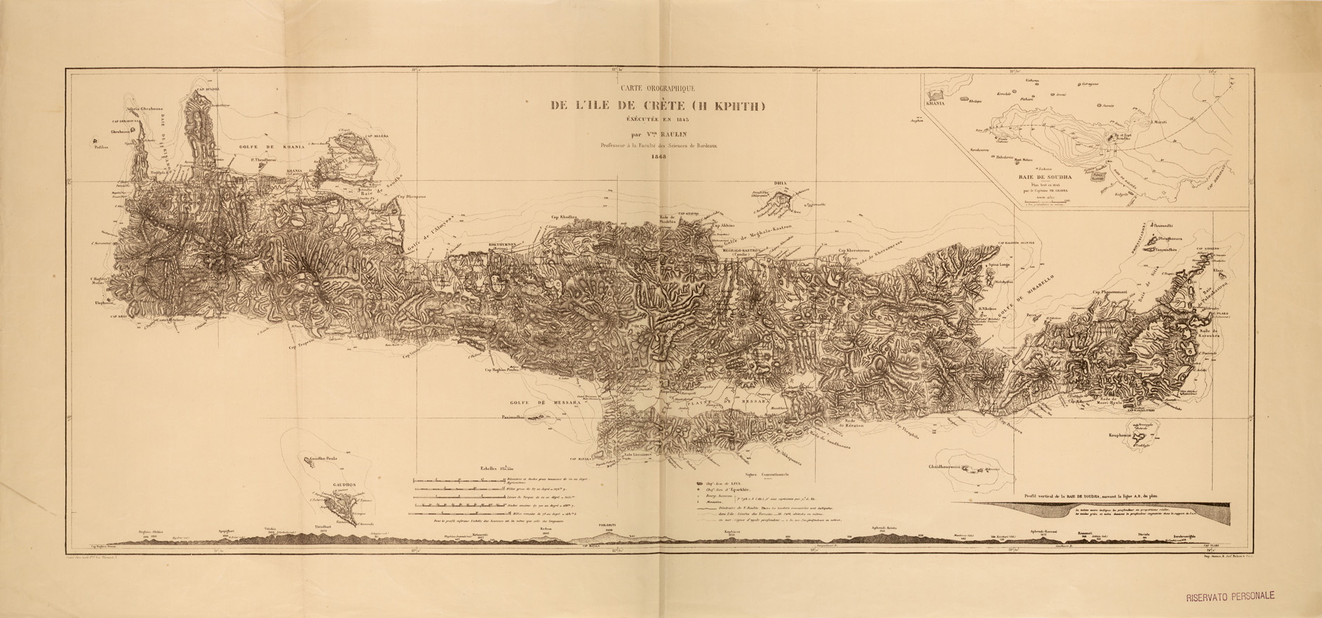 "Realizzata mediante ingrandimento dall' omonima carta alla scala di 1:300.000 ( file SE000481 ) compilata nel 1845 da V. Raulin professore alla facoltà di scienze dell' università di Bordeaux e stampata a Parigi nel 1868 la carta riporta al suo interno un riquadro con la pianta della baia di Soudha alla scala di 1:83.333, il suo profilo verticale e un profilo altimetrico dell' isola."