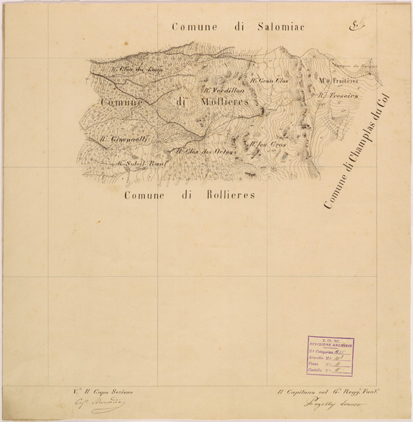 "Rilievi eseguiti da Ufficiali della Scuola Superiore di Guerra, disegnati a colori su carta da disegno montata su tela."