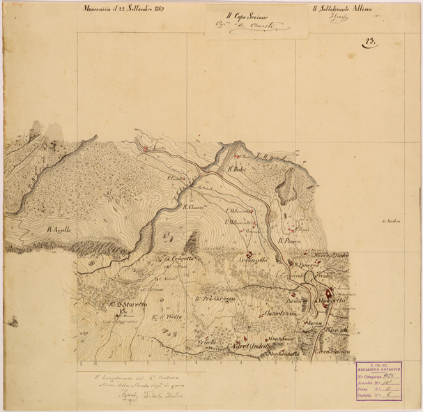 "Rilievi eseguiti da Ufficiali della Scuola Superiore di Guerra, disegnati a colori su carta da disegno montata su tela."
