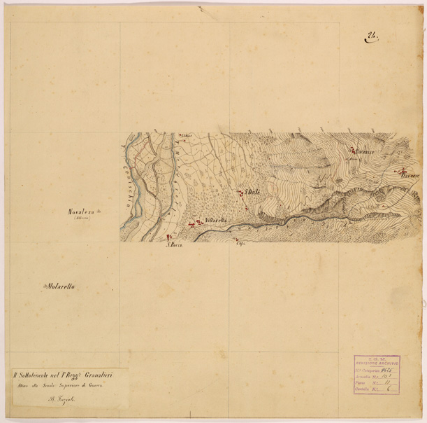 "Rilievi eseguiti da Ufficiali della Scuola Superiore di Guerra, disegnati a colori su carta da disegno montata su tela."