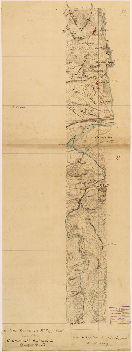 "Rilievi eseguiti da Ufficiali della Scuola Superiore di Guerra, disegnati a colori su carta da disegno montata su tela."