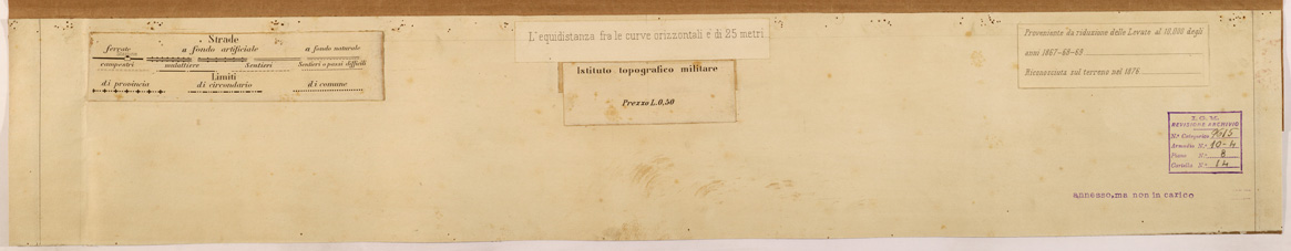 "Originali alla scala di 1:15.000 disegnati per la successiva stampa alla scala di 1:25.000 da Soldati Allievi della Scuola Superiore di Guerra dai rilievi alla scala di 1:10.000 eseguiti negli anni dal 1867 al 1869"