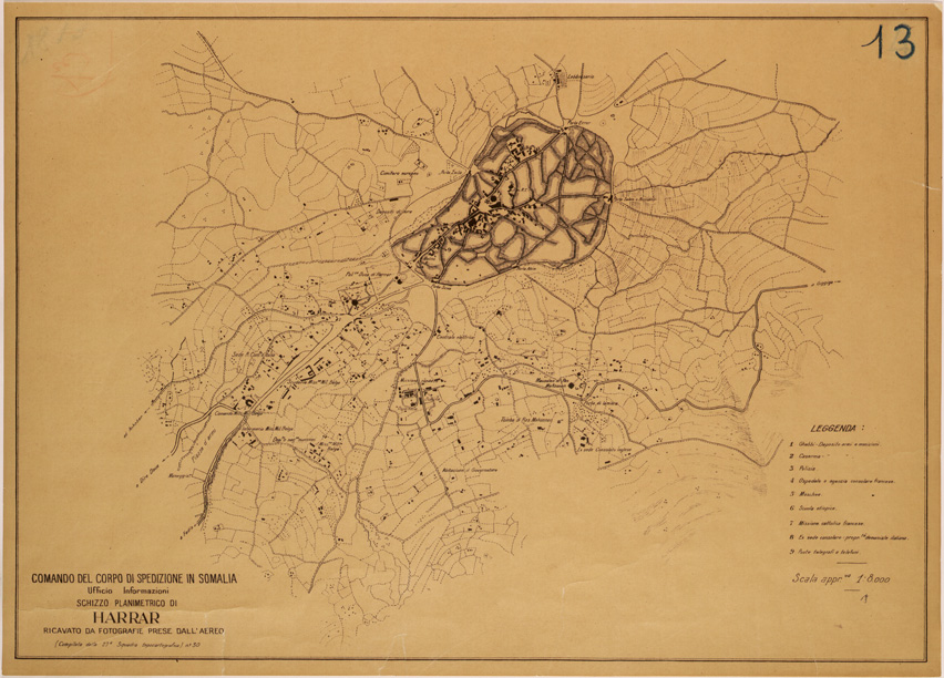 "Copia eliografica ricavata da fotografie aeree dalla 27° Squadra Topocartografica del Comando del Corpo di Spedizione in Somalia."