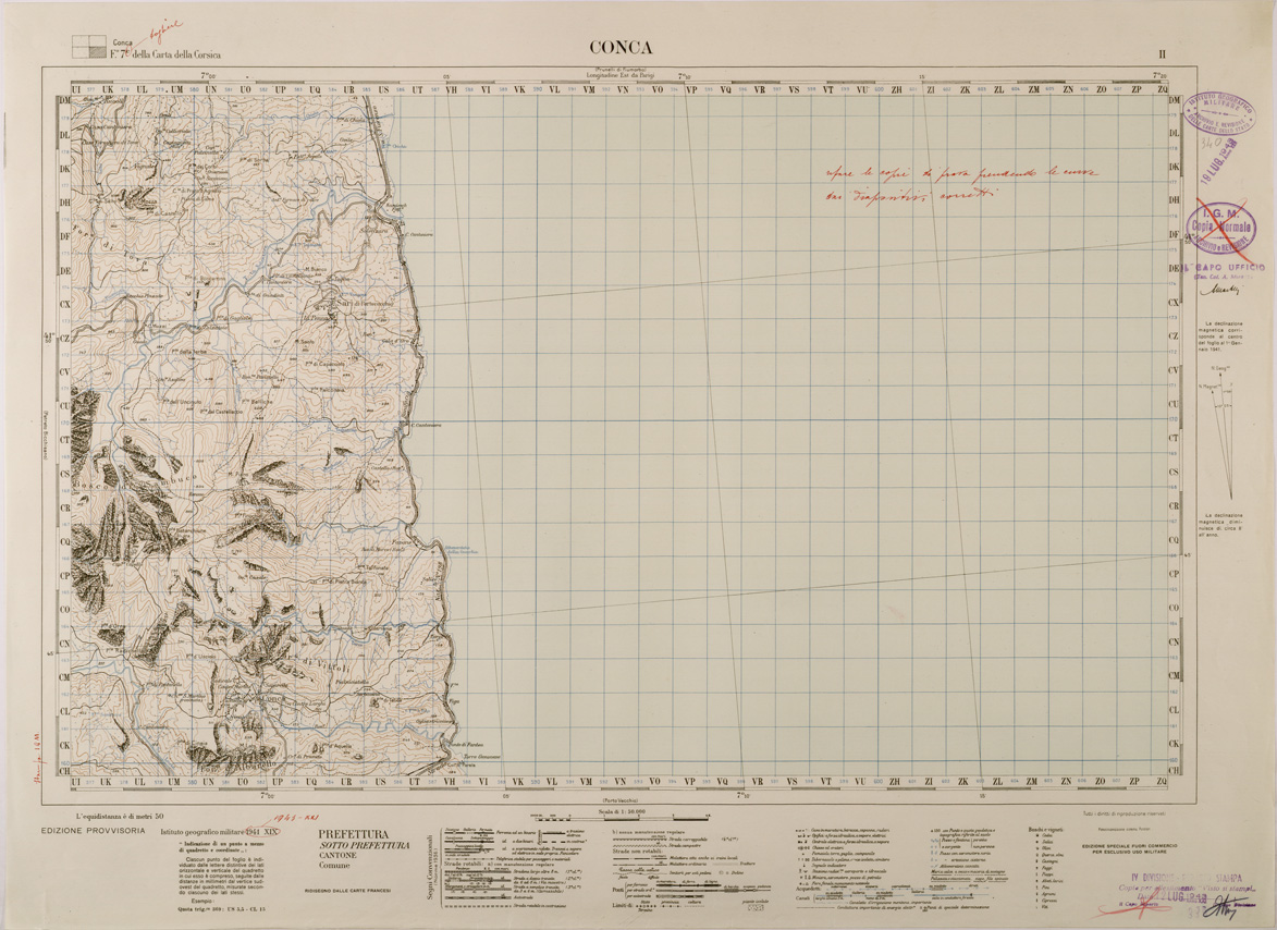 "Carta realizzata dalla Divisione Cartografica dell' IGM mediante ingrandimento della carta Francese alla scala di 1:80.000 del 1889 revisionata nel 1901 la carta è stata disegnata con i segni convenzionali del 50.000 IGM le curve sono state ricavate dalla carta Francese alla scala di 1:40.000 la viabilità aggiornata con la carta Michelin alla scala di 1:200.000 per l' aggiornamento della parte costiera furono consultate fotografie aeree, la compilazione ed il disegno iniziarono nel Febbraio 1941 e terminarono nel Novembre dello stesso anno."