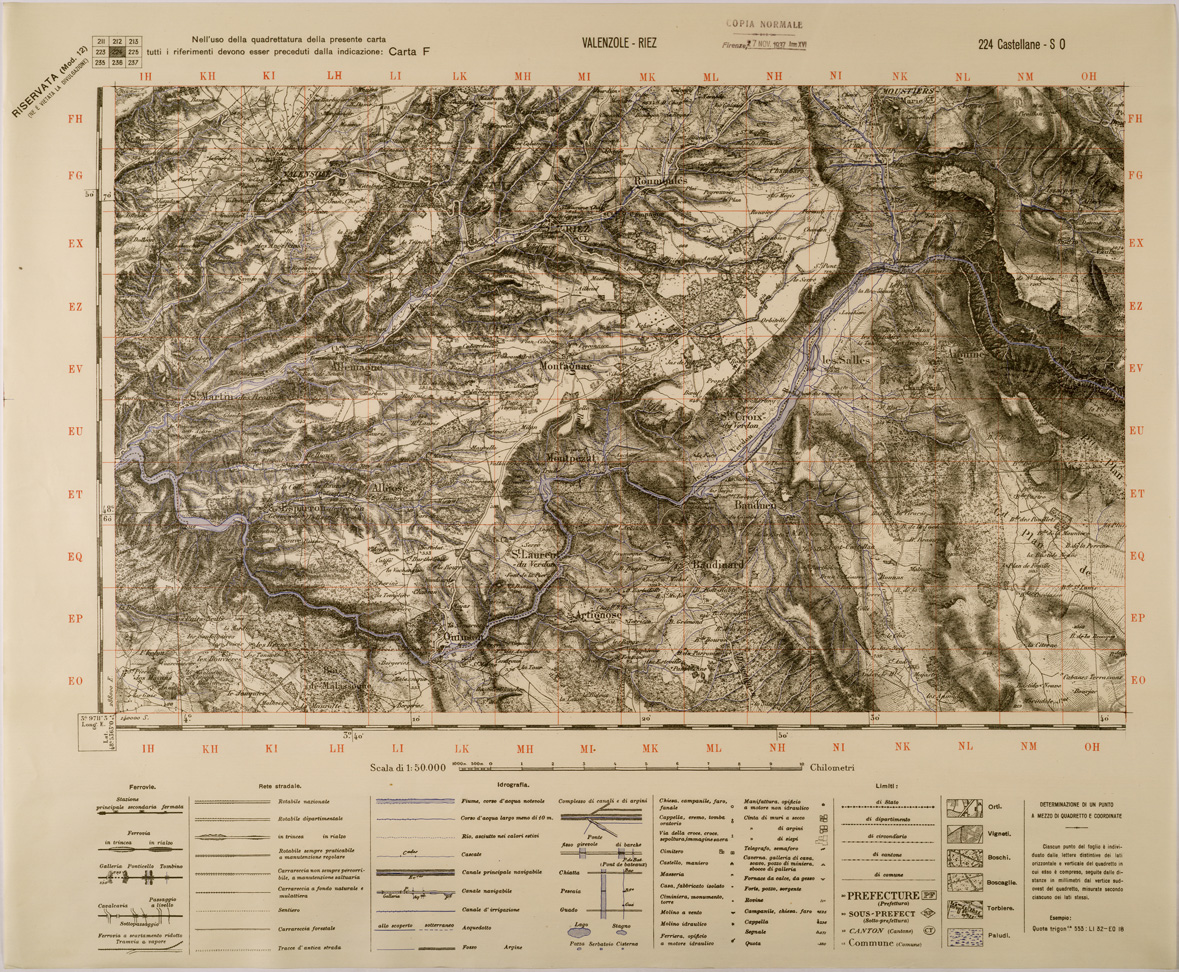 "Carta realizzata dall' IGM mediante ingrandimento della carta alla scala di 1:80.000 dell' Istituto Geografico Francese, edizione 1936 stampa 1937"