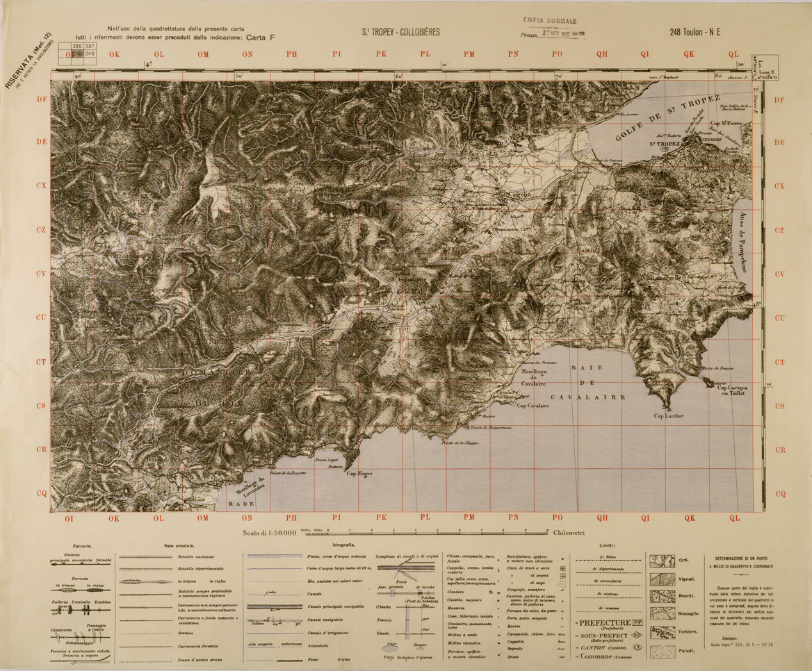 "Carta realizzata dall' IGM mediante ingrandimento della carta alla scala di 1:80.000 dell' Istituto Geografico Francese, edizione 1936 stampa 1937"