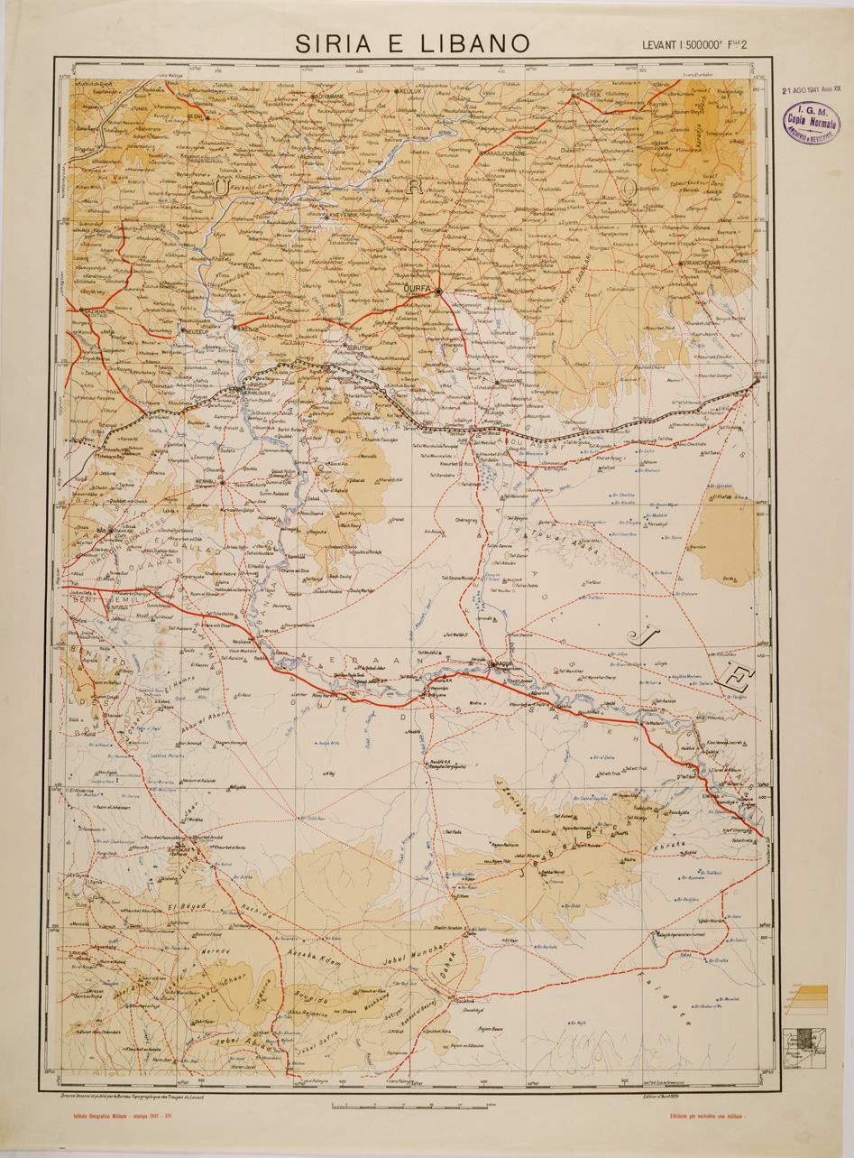 "Riproduzione da analoga carta del Bureau Topographique des Troupes du Levant Francese stampa IGM 1941"