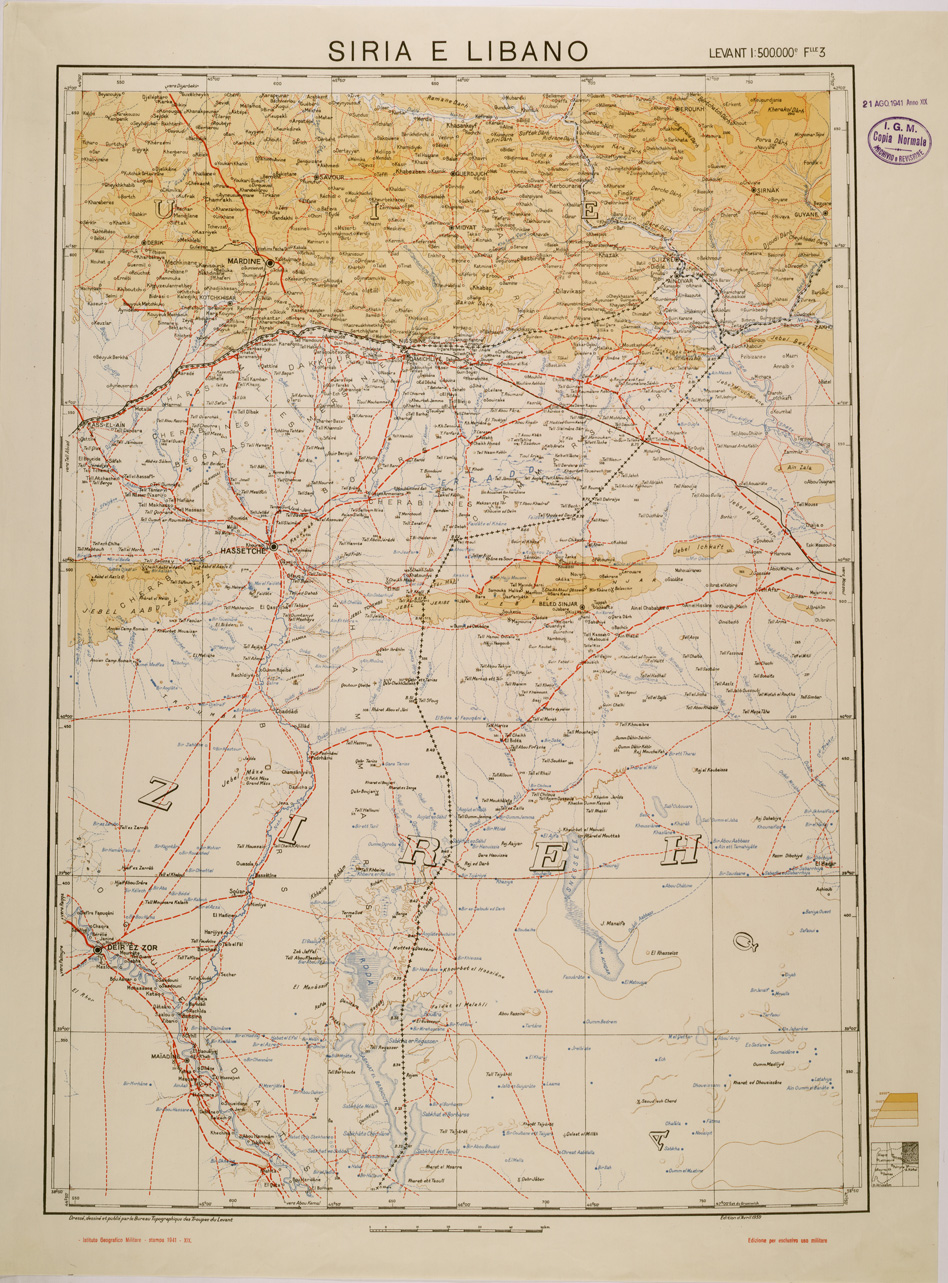 "Riproduzione da analoga carta del Bureau Topographique des Troupes du Levant Francese stampa IGM 1941"
