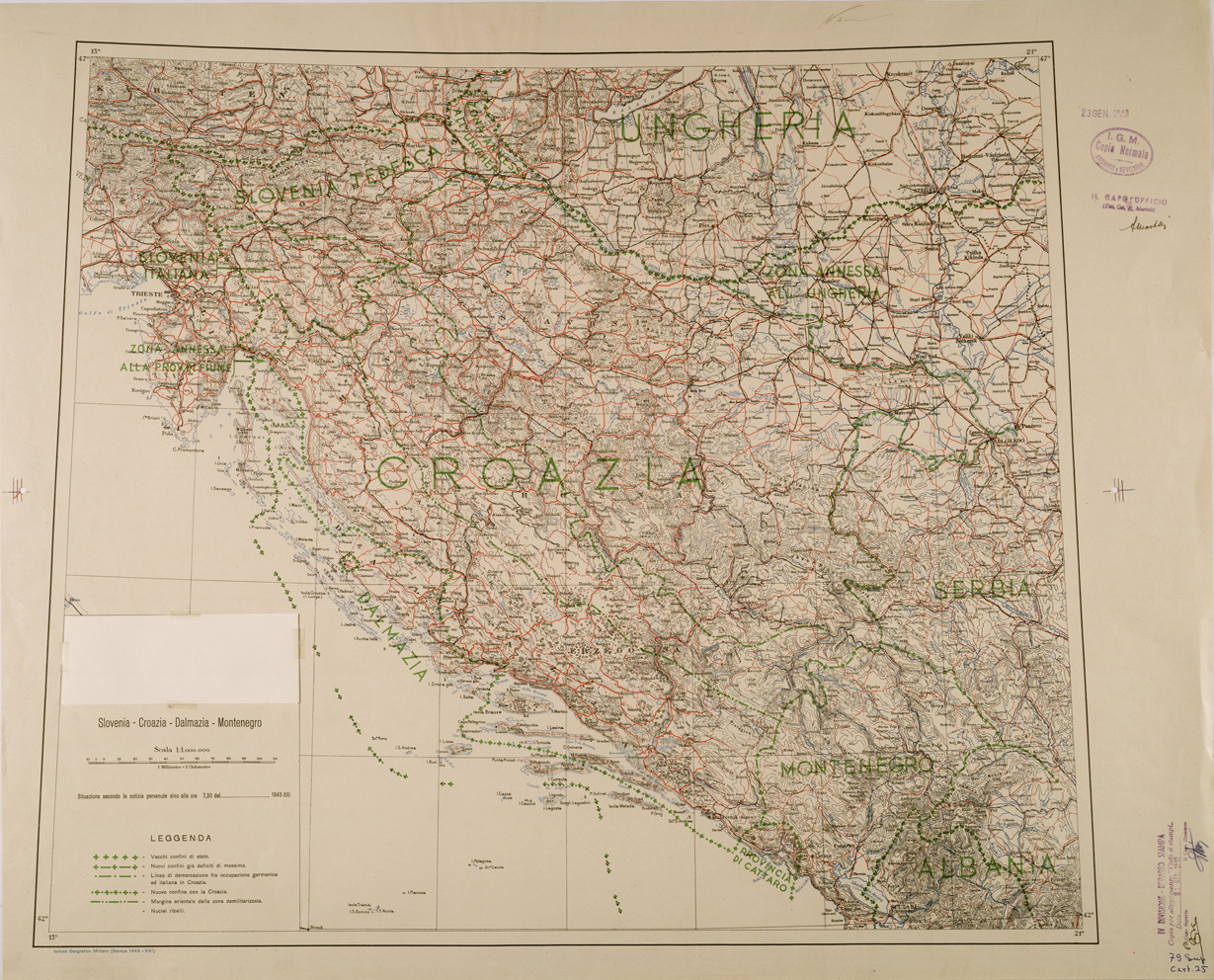 "Carta realizzata dall' IGM ricavandola dai tipi del Milionesimo Internazionale, stampata nel 1943 riporta i nuovi confini di Stato stabiliti da Italia e Germania nel caso di vittoria nel conflitto in corso."