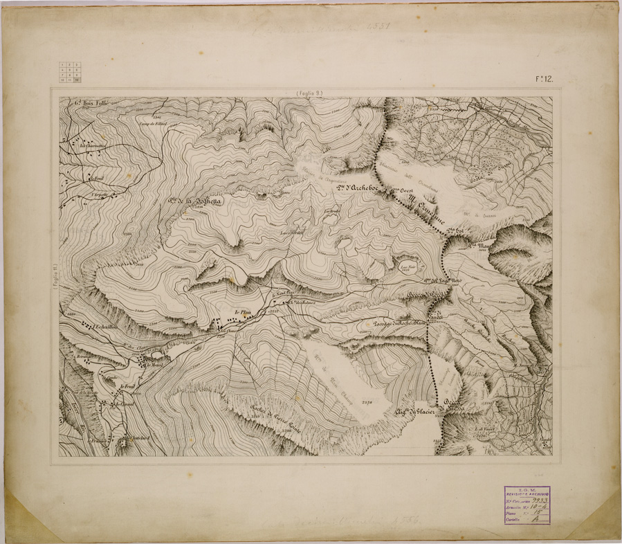 "Carta speciale divisa in 12 fogli la maggior parte dei quali andata perduta durante la guerra 1940 - 1945 rimangono solo i fogli 8 - 10 - 12 disegnata a penna su cartone la carta è stata compilata mediante ingrandimento dei rilievi al 50.000 per la parte Italiana e della " carte de la frontiere des alpes " alla scala di 80.000 per il territorio Francese."