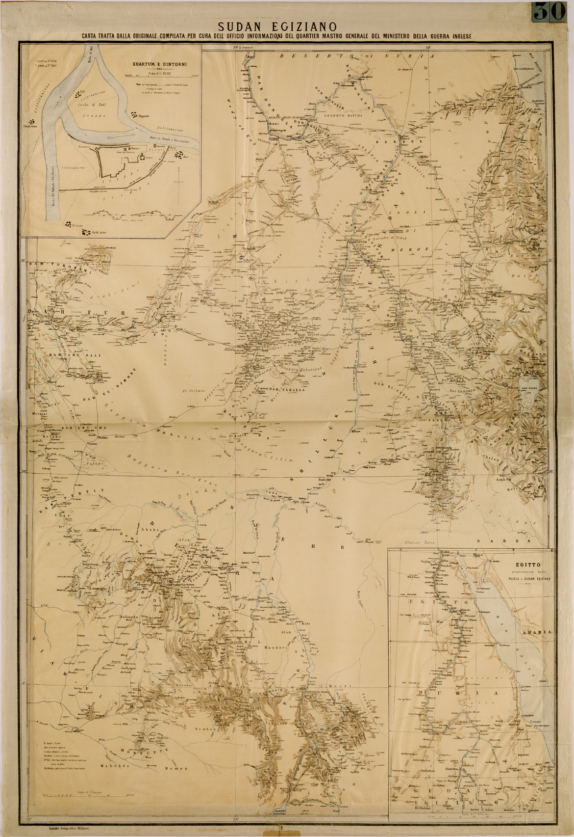 "Riproduzione IGM dell' analoga carta del Ministero della Guerra Inglese, all' interno sono riportate una pianta della città di Khartum e dintorni alla scala di 1:35.000 e una carta dell' Egitto alla scala di 1:5.700.000"