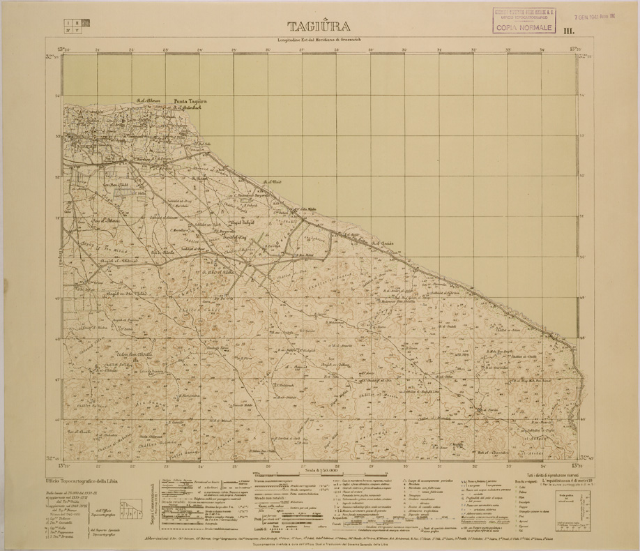 "Carta realizzata dall' Ufficio Topocartografico della Libia dai rilievi alla scala di 1:25.000 del 1931 aggiornati nel 1939 - 1940 Toponomastica riveduta a cura dell' Ufficio Studi e Traduzioni del Governo della Libia."